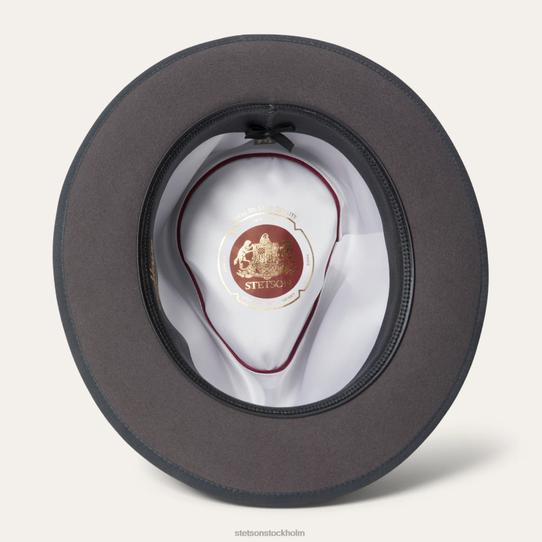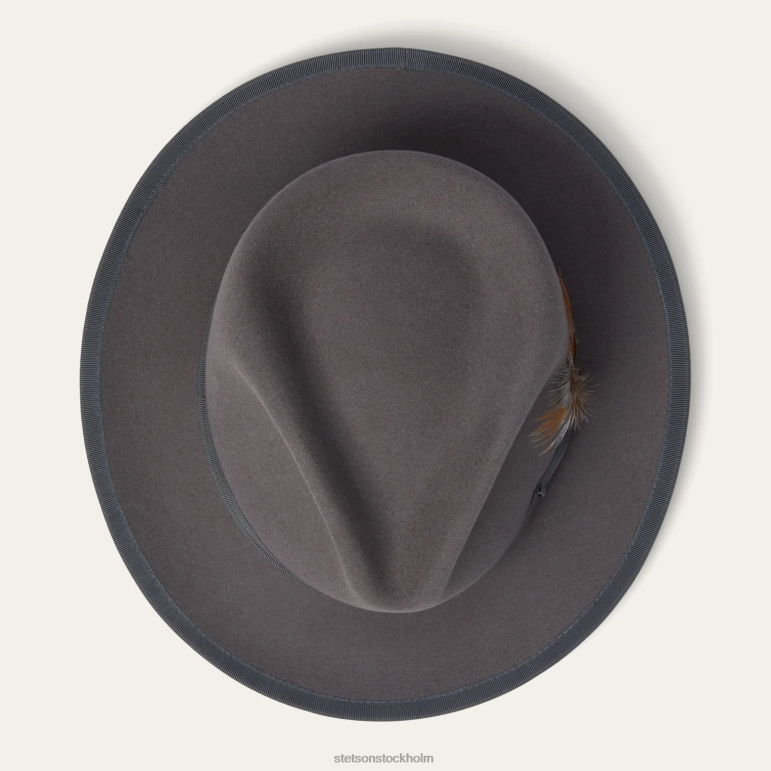 whippet fedora är konstruerad av fast finish, pälsfilt och har en krona med nyp, bunden kantbrätte, invändigt svettband av kohud och grosgrain hattband med fjäderaccent.