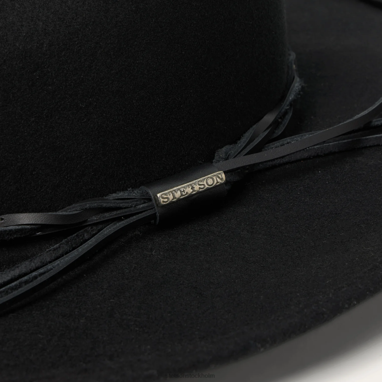 den gus-krossbara utomhushatten är gjord av krossbar ullfilt och har en gus-kronaform och ett vridet hattband i läder. ullfilt.